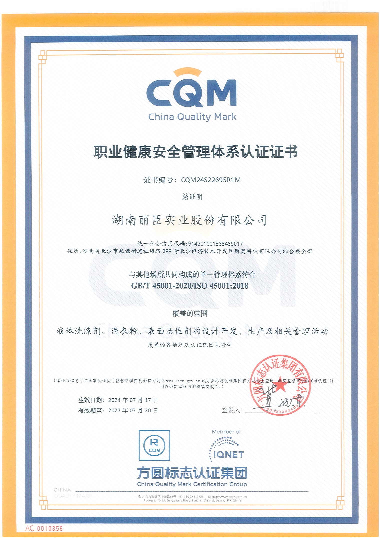 湖南麗臣職業(yè)健康安全管理體系認(rèn)證證書